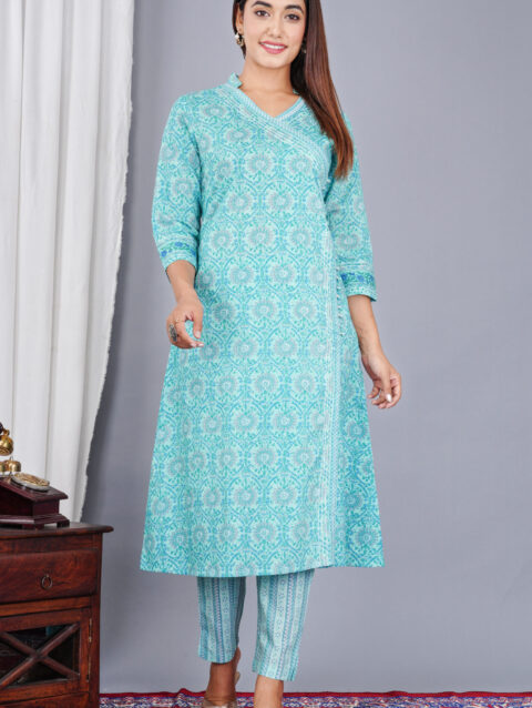 Rajputana Camisa Printed Cotton Angrakha Kurti Pant Set for Women