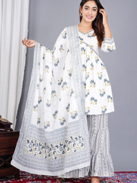Rajputana Camisa Women Cotton Floral Printed Alia Cut Kurti Sharara and Dupatta Set for Wedding & Party