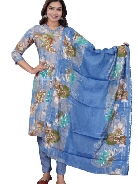 Rajputana Camisa Floral Printed Pure Muslin Stylish Ethnic Kurta Pant Dupatta Set for Women